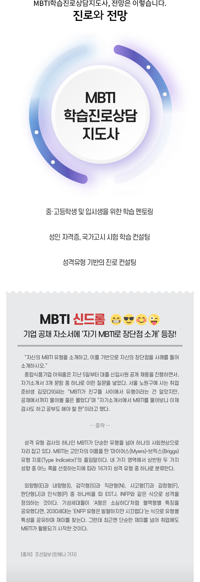 MBTI ¼º°ÝÀ¯Çüº° ´Ù¸¥ ÇнÀ Àü·«À» ÀÌÇØÇϰí,À̸¦ Åä´ë·Î ³»´ãÀÚ¿¡°Ô ÀûÀýÇÑ ÇнÀ ¹× Áø·Î ÄÁ¼³ÆÃÀ» ÇÕ´Ï´Ù.