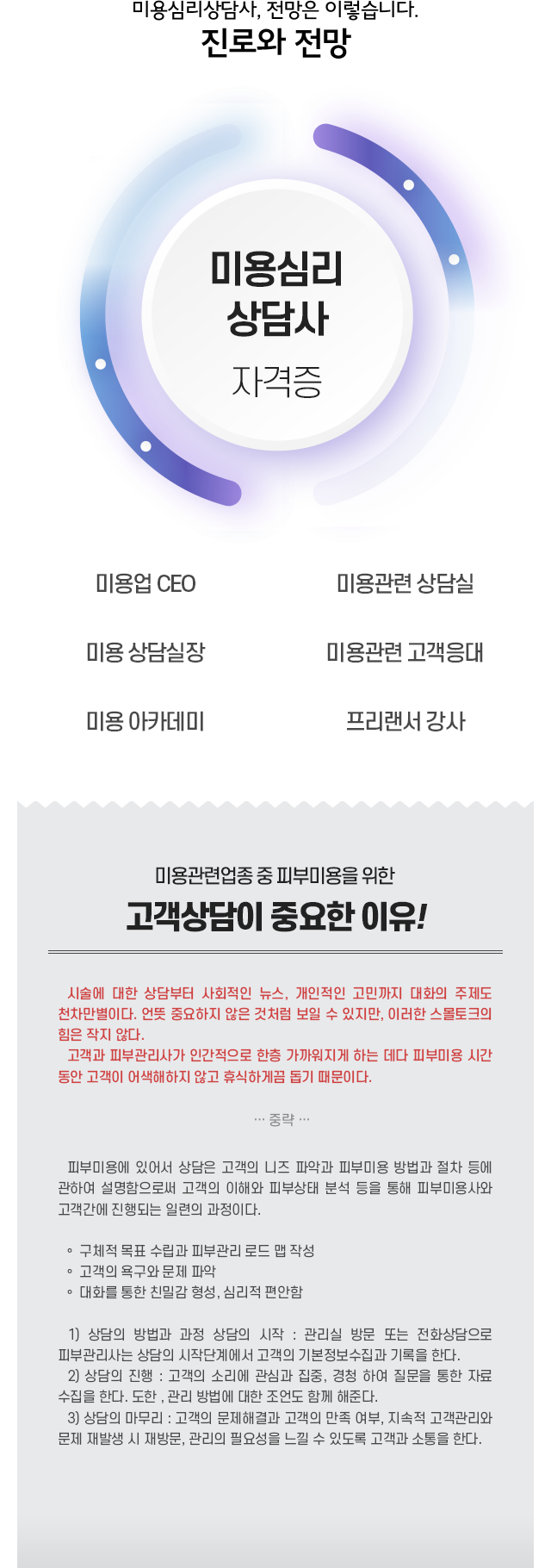 • º» °úÁ¤ÀÇ ÇнÀÀ» ÅëÇØ ¹Ì¿ë ¹× »çȸ½É¸®ÇÐÀÇ °³³ä¿¡ ´ëÇÑ ÀÌÇØ¸¦ ¹ÙÅÁÀ¸·Î ¹Ì¿ë ÇöÀå¿¡¼­ ÇÊ¿äÇÑ ½É¸® »ó´ã ¼­ºñ½º¸¦ ÅëÇØ °í°´À» Á» ´õ ÀÚ¼¼È÷ ÀÌÇØÇÏ°í °í°´ÀÇ ´ÏÁî¿¡ ¸ÂÃç È¿°úÀûÀÎ »ó´ã ¼­ºñ½º¸¦ Á¦°øÇÒ ¼ö ÀÖµµ·Ï ÇÑ´Ù.